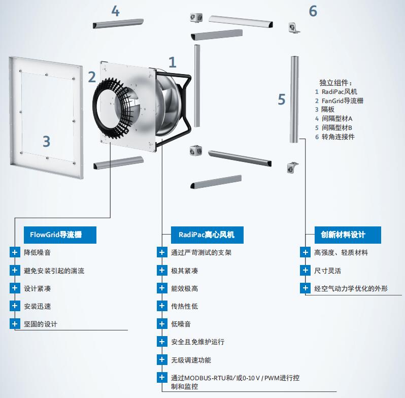 FanGrid風(fēng)墻的核心驅(qū)動力是現(xiàn)代化的綠色科技EC電機,它在滿負荷和部分負荷運行時均非常高效。FanGrid風(fēng)墻具有全新的控制器,可輕松激活并行運行的風(fēng)機。FanGrid風(fēng)墻模塊可作為即插即用的單元和相關(guān)的安裝支架同時提供,也可作為完整的套件直接進行現(xiàn)場安裝。套件包括風(fēng)機、導(dǎo)流柵、隔板、轉(zhuǎn)角連接件、間隔型材和螺栓。