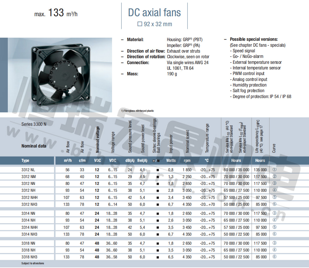 3314NH3風(fēng)量:133m³/h 電壓:24v 噪音:50Db 功率:6.7W 轉(zhuǎn)速:4350r/min