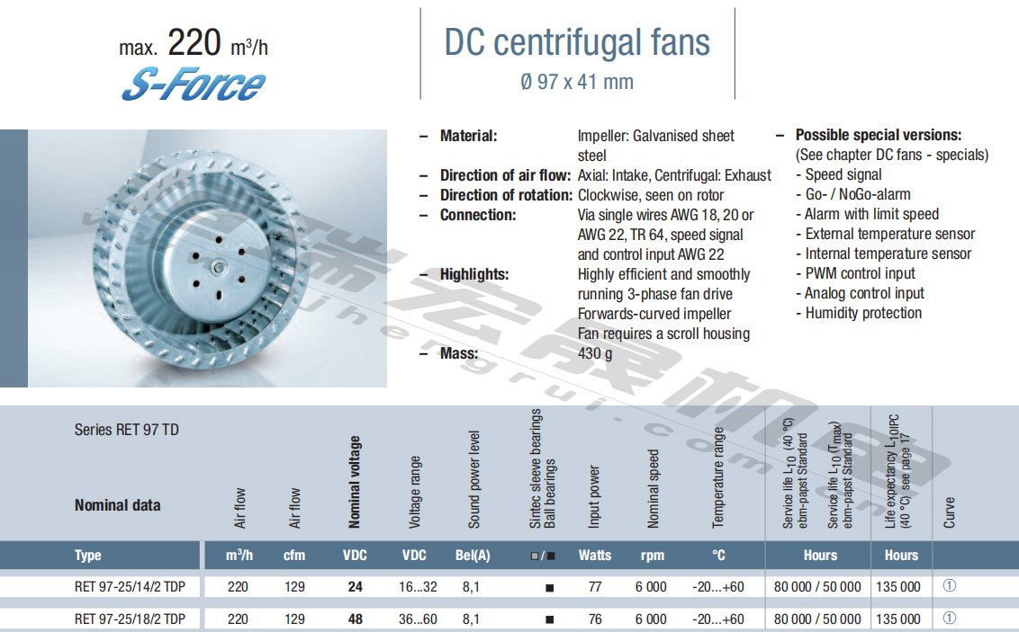 RET97-25/18/2TDP風(fēng)量:220m³/h 電壓:48v 電流:8.1A 功率:76W 轉(zhuǎn)速:6000r/min
