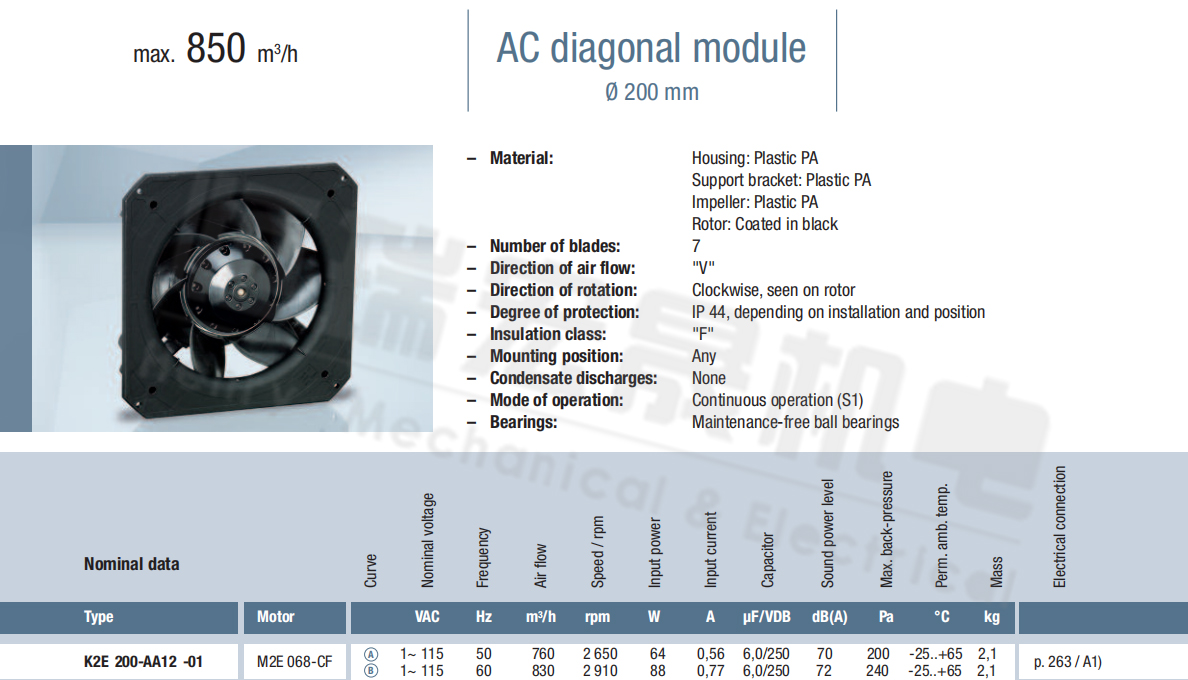 K2D200-AA02-02風量:780m³/h 電壓:400v 電流:0.15A 功率:65W 轉(zhuǎn)速:2700r/min