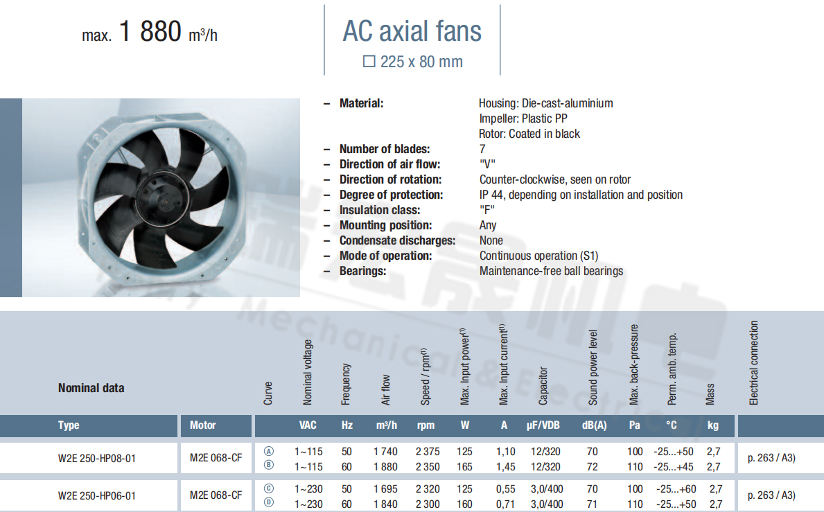 W2E250-HP06-01風量:1695m³/h 電壓:230v 電流:0.55A 功率:125W 轉(zhuǎn)速:2320r/min