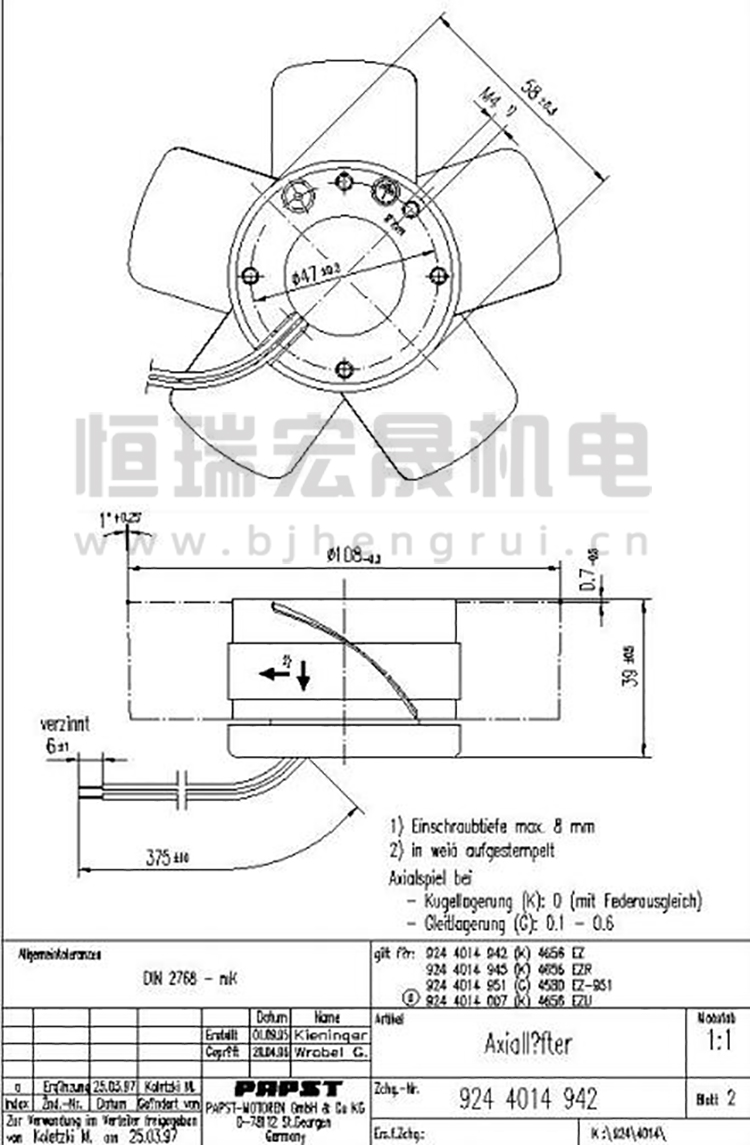 北京恒瑞宏晟機電設備有限公司經營離心風機、軸流風扇、貫流風扇、變頻器風扇數(shù)十年,產品匯聚世界風機風扇品牌,長期供應德國ebmpapst(依必安派特)風機,型號齊全,大量現(xiàn)貨。